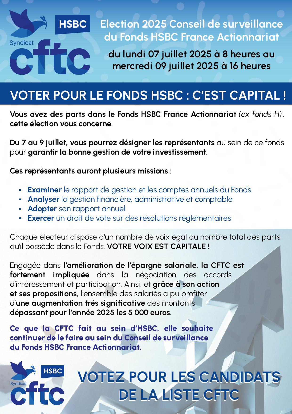 Du 7 au 9 juillet 2025, les élections des représentants au Conseil de surveillance du Fonds HSBC France Actionnariat vont avoir lieu.