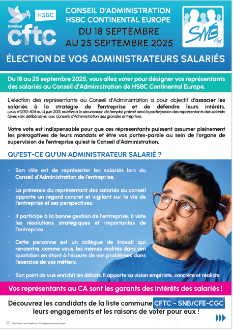 Avec les résultats financiers en baisse au premier semestre 2025, en pleine période de restructuration et d'un PSE en cours de négociation, la CFTC HSBC vous alerte sur l'importance de votre vote et de votre voix.
