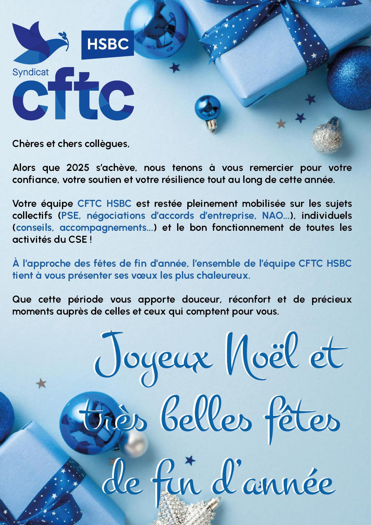 À l’approche des fêtes de fin d’année, l’ensemble de l’équipe CFTC HSBC tient à vous présenter ses vœux les plus chaleureux.