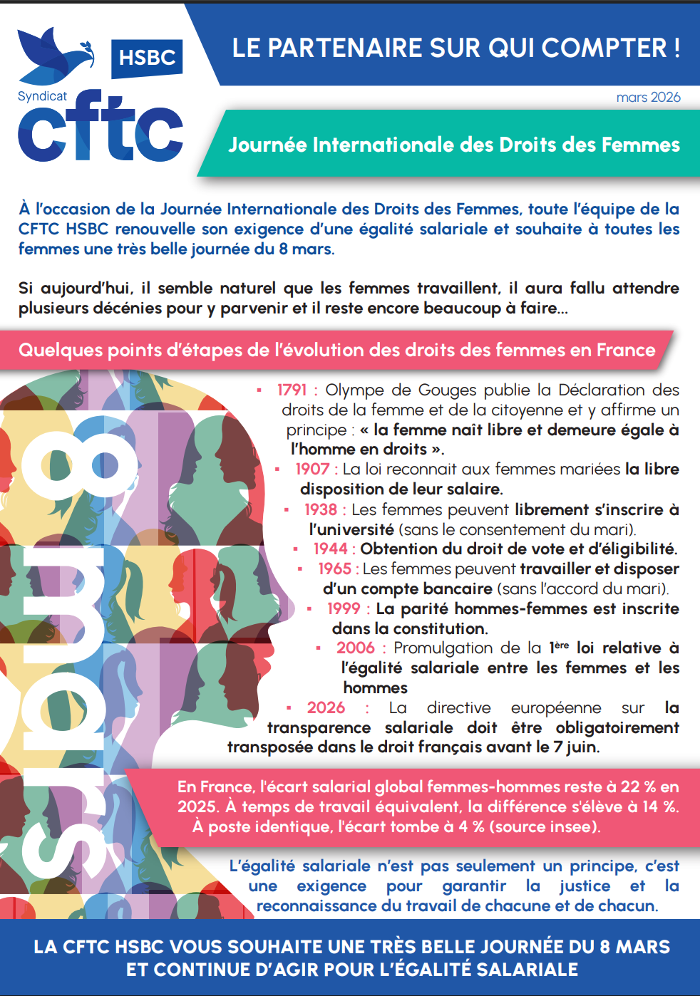 | LA CFTC HSBC VOUS SOUHAITE UNE TRÈS BELLE JOURNÉE DU 8 MARS ET CONTINUE D’AGIR POUR L’ÉGALITÉ SALARIALE |